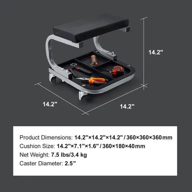 Caster Diameter: 2.5"/6.35 cm,Capacity: 250 lbs/113 kg,Material: Steel+PU,Product Dimensions: 14.2"14.2"14.2"/363636 cm,Cushion Size: 14.2"7.1"1.6"/36184 cm,Net Weight: 7.5 lbs/3.4 kg