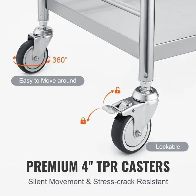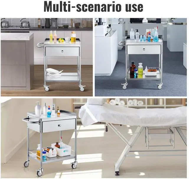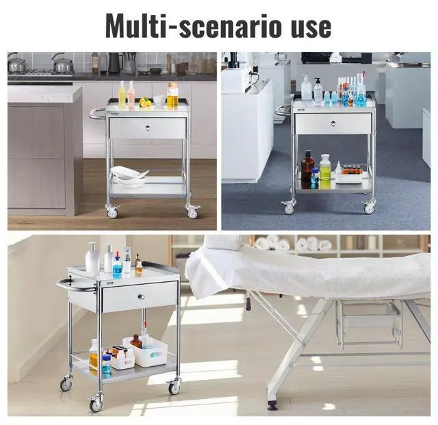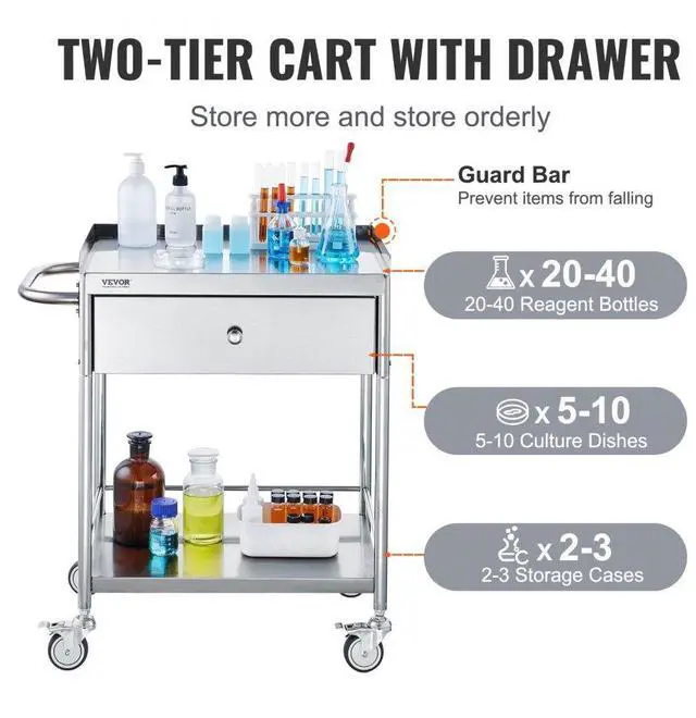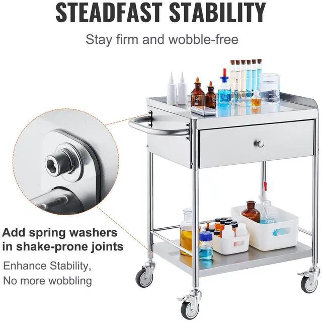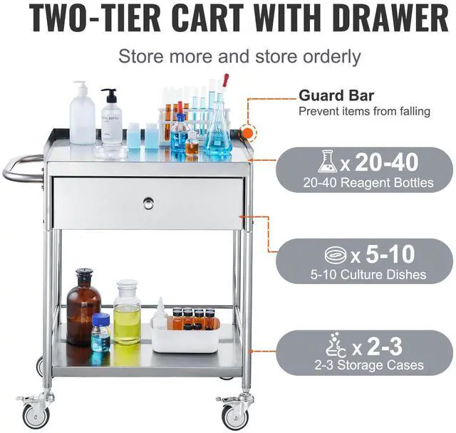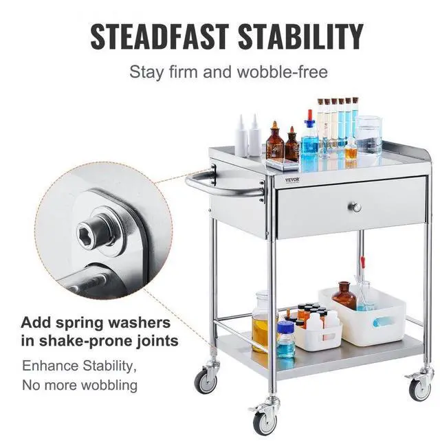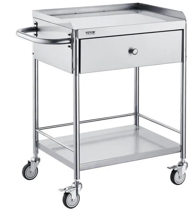VEVOR Medical Cart, 2-Layer Stainless Steel Cart 220 lbs Weight Capacity, Lab Utility Cart with 360° Silent Wheels and a Drawer for Lab, Clinic, Kitchen, Salon