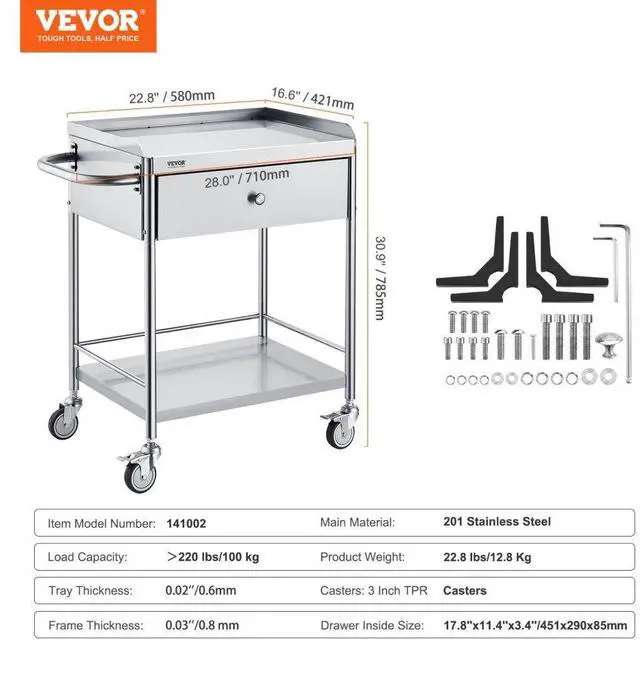 Tray Thickness: 0.02''/0.6 mm,Load Capacity: >220 lbs/100 kg,Casters: 3 Inch TPR Casters,Bottom Partition Size: 15.6'' x 21.9''/395 x 555 mm,Item Model Number: 141002,Product Weight: 28.2 lbs/12.8 kg,Frame Thickness: 0.03''/0.8 mm,Frame Column: 21.9'' x 19.5''/ 5.5 mm x 495 mm,Top Layer: 22.8'' x 16.5''/580 x 420 mm,Drawer Inside Size: 17.8'' x 11.4'' x 3.4''/451 x 290 x 85 mm,Product Size: 28.0 x 16.6 x 30.9 in / 710 x 421 x 785 mm,Drawer Outside Dimensions: 20.5'' x 13.3'' x 5.8''/521 x 337 x 146 mm