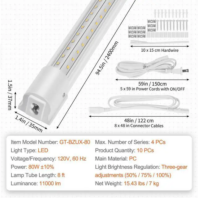 Product Quantity: 10 PCs,Anti-interference Function: Anti high frequency and anti RF interference,Product Size: 94.5 x 1.4 x 1.5 in/2400 x 35 x 37 mm,Voltage/Frequency: 120V, 60 Hz,Light Brightness Regulation: Three-gear adjustments (50% / 75% / 100%),Luminance: 10000 lm,Item Model Number: GT-BZUX-80,Light Type: LED,Lamp Tube Length: 8 ft/203.5 mm,Max Number of Series: 4 PCs,Net Weight: 15.43 lbs/7 kg,Power: 80W ±10%,Main Material: PC