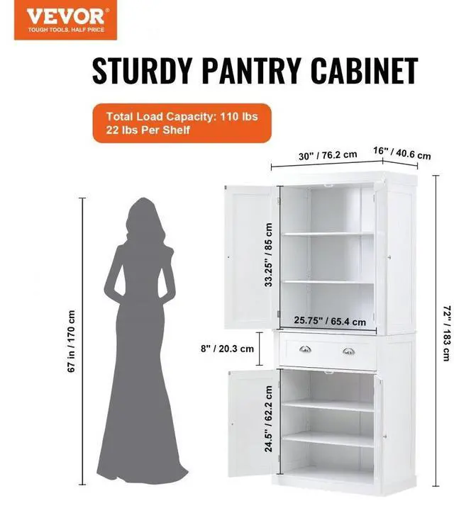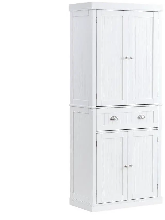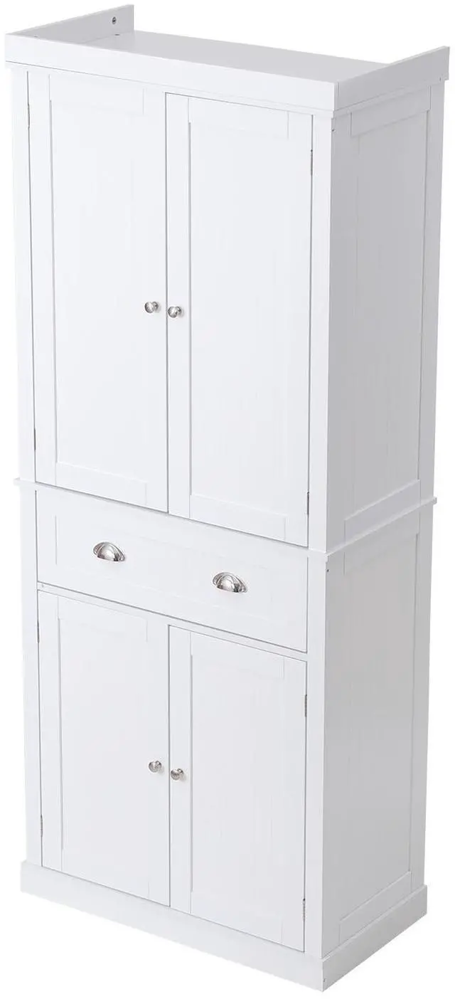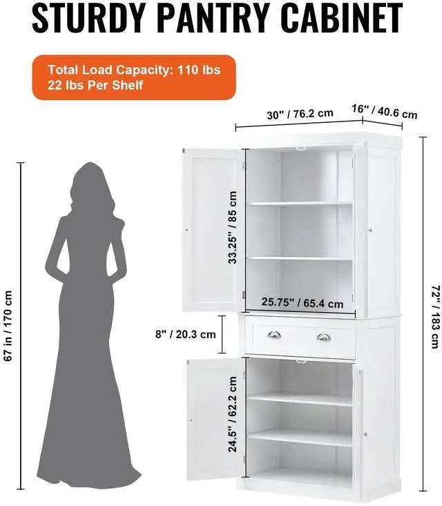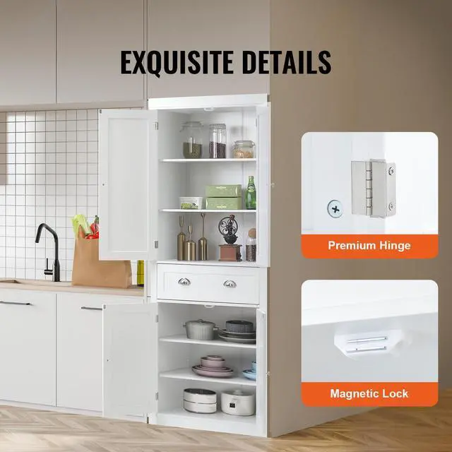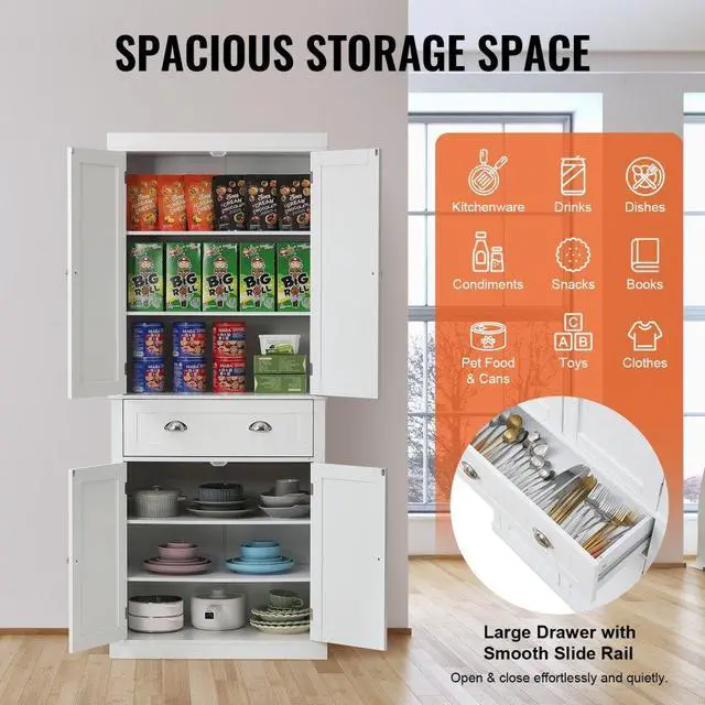 VEVOR 72" Kitchen Pantry Storage Cabinet, Freestanding Utility Cabinets with Doors, Drawer and 3 Adjustable Shelves, Tall Food Buffet Pantries for Kitchen, Living Room, Dinning Room, Laundry, White