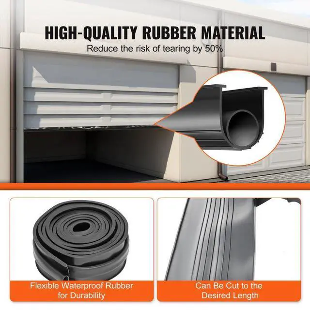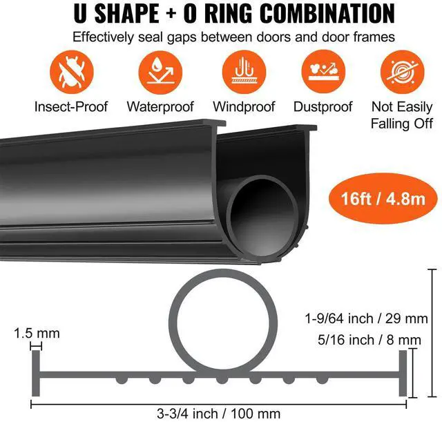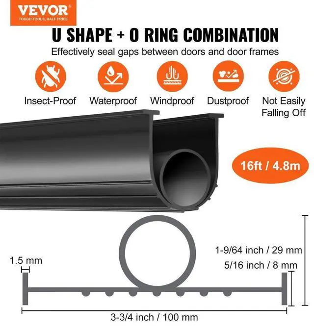 VEVOR Garage Door Seals Bottom Rubber, U Shape +O Ring Garage Door Weather Stripping, Universal Weatherproof Threshold Buffering Sealing Rubber , 5/16 inch T-ends and 3 3/4 inch Width (16 Ft, Black)