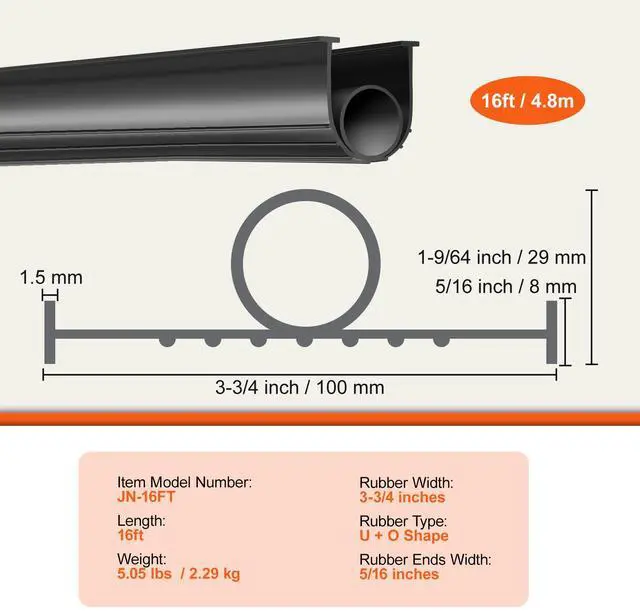 Type: U + O Shape,Length: 16 ft / 4.8 m,Rubber Ends Width: 5/16 Inch / 8 mm,Item Model Number: JN-16FT,Rubber Width: 3-3/4 inch / 100 mm,Weight: 5.05 lbs / 2.29 kg