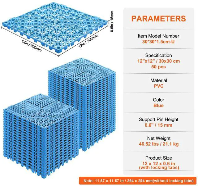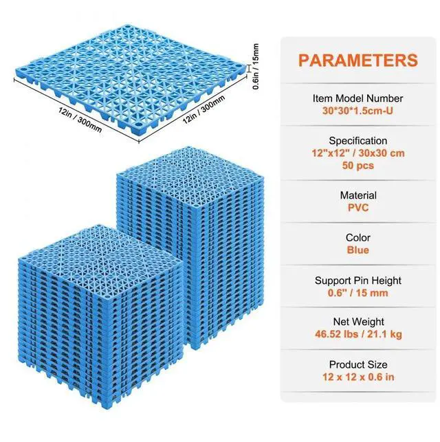 Support Pin Height: 0.6''/15 mm,Color: Blue,Item Model Number: 30*30*1.5cm-U,Specification: 12"" x 12""/30 x 30 cm, 50 pcs,Material: PVC,Net Weight: 46.52 lbs/21.1 kg,Product Size: 12 x 12 x 0.6 inch/300 x 300 x15 mm