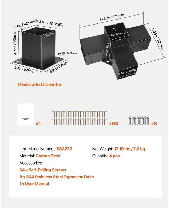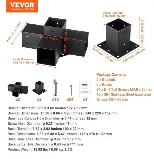 Structure Type: Four-Way,Specifications: 4" x 4",Base Outer Dimensions: 6.89 x 6.89 x 5.47 inches / 175 x 175 x 139 mm,Model: SSA2E2,Product Weight: 18.92 lbs / 8.58 kg, ± 3%,Quantity: 2 x Four-Way Corner Brackets, 2 x Bases,Sunshade Canopy Hanging Holes: Yes,Product Dimensions: 13.38 x 8.66 x 5.98 inches / 340 x 220 x 152 mm,Main Material: Q235B,Drainage Hole Dimensions: 3.23 x 3.23 inches / 82 x 82 mm