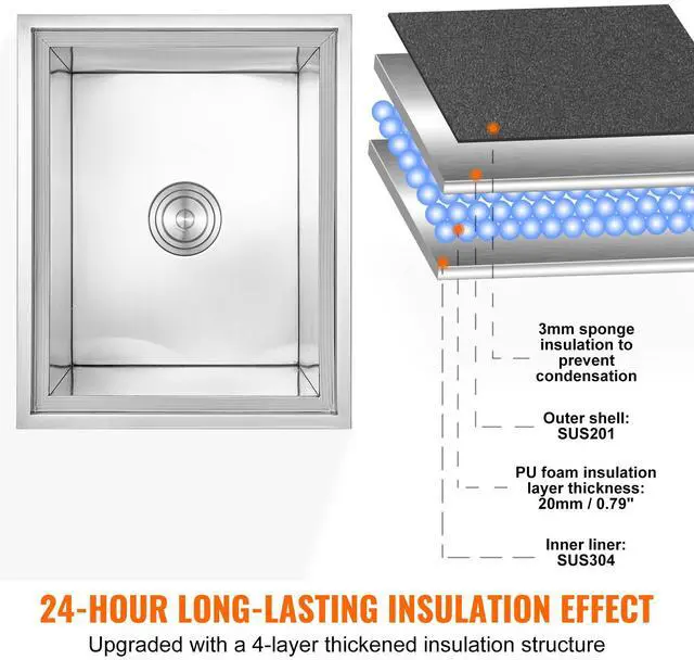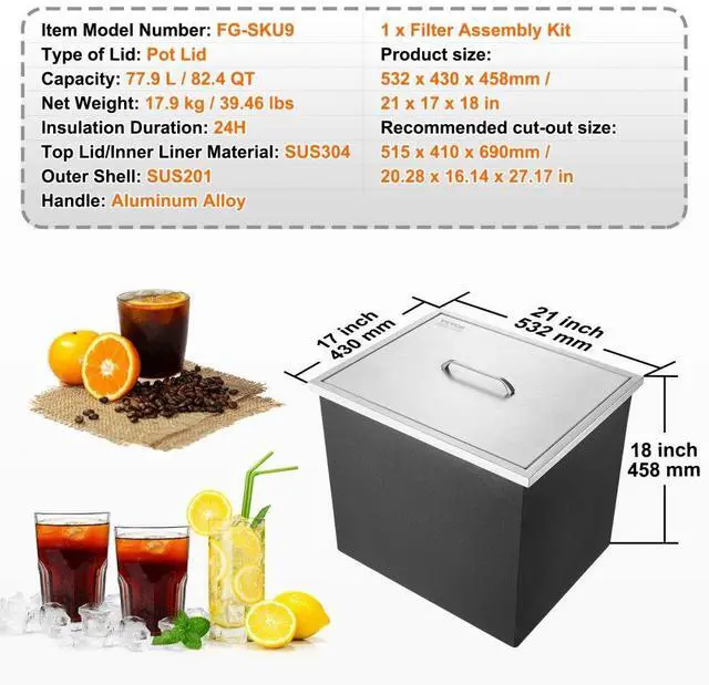 Top Lid/Inner Liner Material: SUS304,Capacity: 77.9L / 82.4QT,Item Model Number: FG-SKU9,Outer Shell: SUS201,Insulation Duration: 24H,Net Weight: 17.9 kg / 39.46 lbs,Handle: Aluminum Alloy