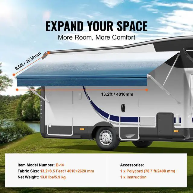 VEVOR RV Awning Fabric Replacement, 13'2" Fabric Length for 14' Awning, Heavy Duty 3-Ply 16oz PVC Camper Awning Fabric, Waterproof & UV Protection Outdoor Canopy for RV, Trailer, Motorhome, Blue Fade