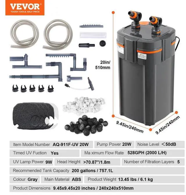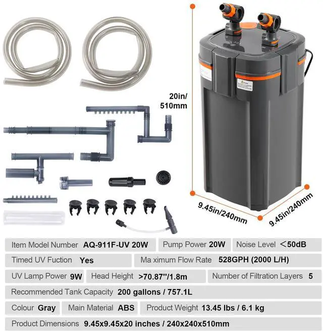 Recommended Tank Capacity: 200 gallons / 757.1L,Pump Power: 20W,Color: Gray,Maximum Flow Rate: 528GPH (2000 L/H),Product Dimensions: 9.45x9.45x17.32 inches / 240x240x440mm,UV Lamp Power: 9W,Number of Filtration Layers: 5,Noise Level: <50dB,Head Height: >70.87''/1.8m,Model: AQ-911F-UV 20W,Product Weight: 13.45 lbs / 6.1 kg,Timed UV Function: Yes,Main Material: ABS