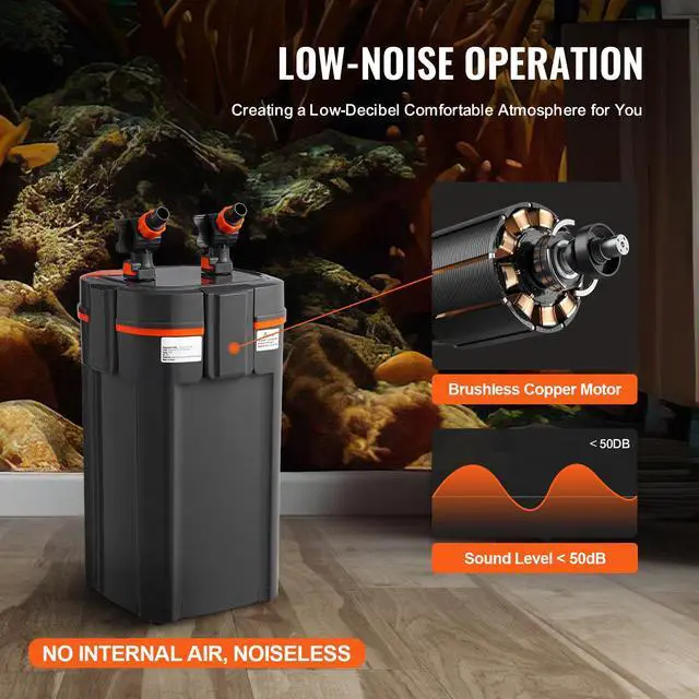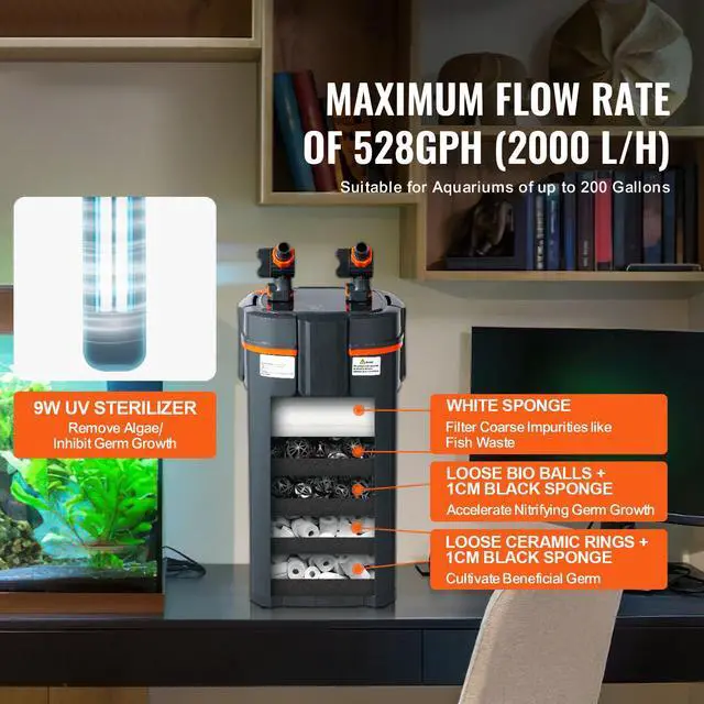 VEVOR Aquarium Filter 528GPH, 5-Stage Canister Filter 200 Gallon, Ultra-Quiet Internal Aquarium Filter with UV Protection, Submersible Power Filter with Multiple Function for Fish Tanks, 20W