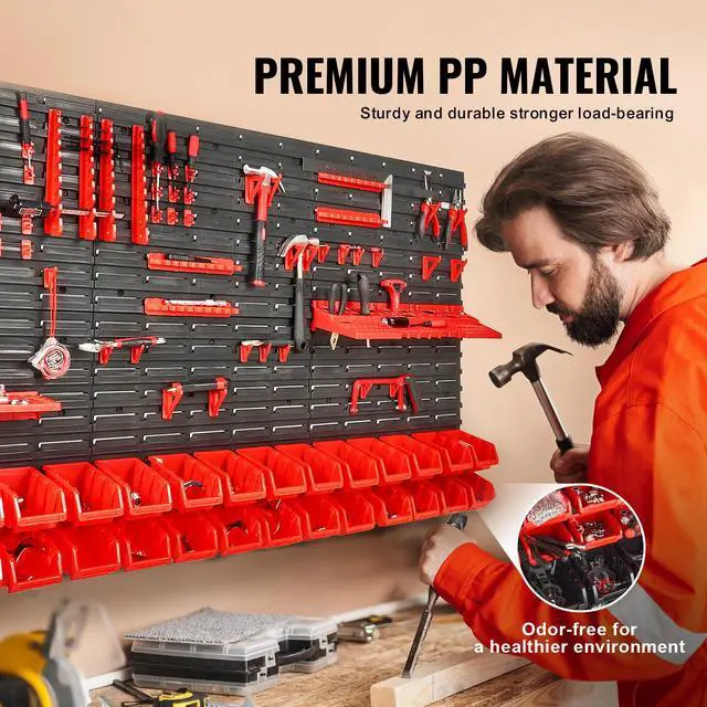 VEVOR Wall Mounted Storage Bins, 30-Bin Parts Rack Organizer Garage Plastic Shop Tool with Wall Panels/Tool Holders/Hooks, Tool Organizer for Nuts, Bolts, Screws, Nails, Beads, Buttons, Black and Red