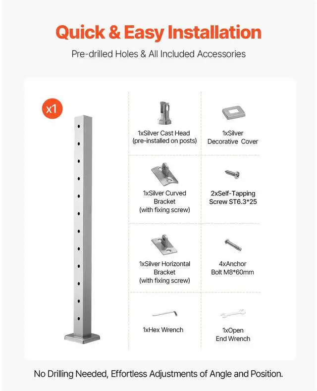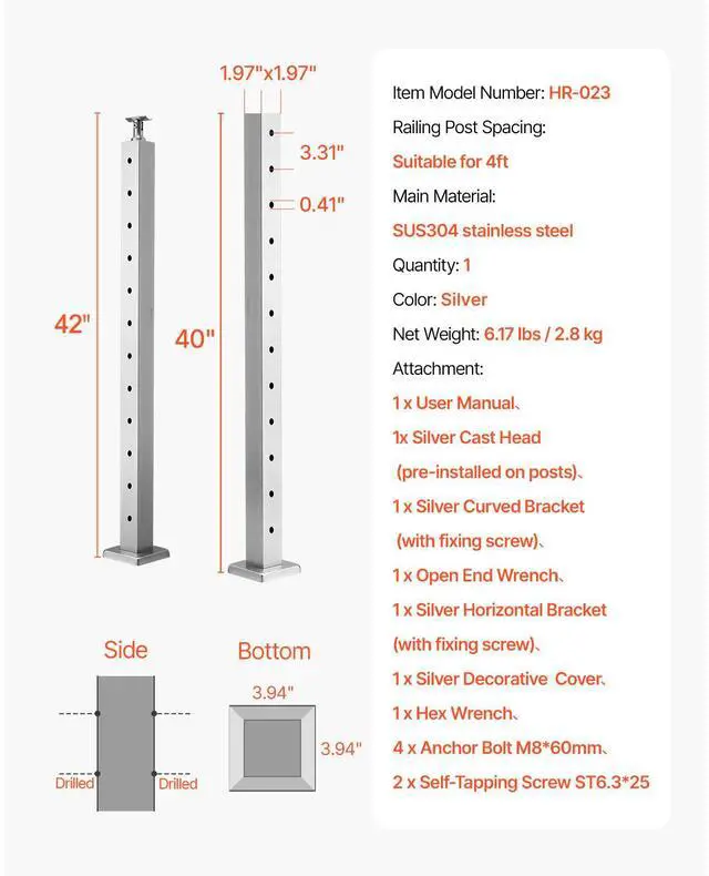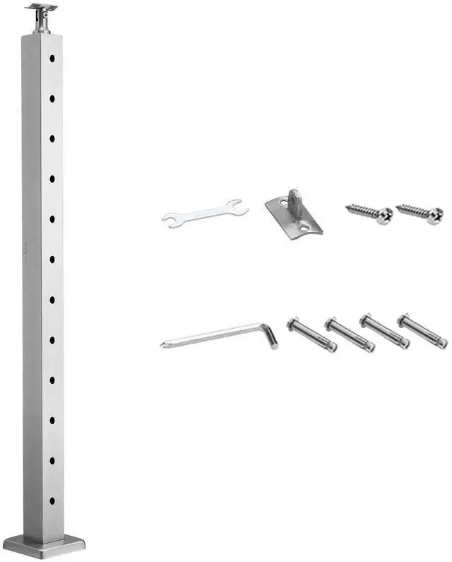 Thickness: 0.06"/1.5 mm,Connect Methods: Concrete/Wood,Item Size: 42 x 1.97 x 1.97"/106.7 x 5 x 5 cm,Base Size: 5 x 3.46 x 0.61"/127 x 88 x 15.5 mm,Holes Distance: 3.15"/80 mm,Color: Silver,Item Model Number: VV-106.7x5x5-LGZYKSLIVER,Material: Stainless Steel+Powder Coated,Hole Diameter: 4.13"/105 mm,Item Weight: 2.45 kg/5.4 lbs