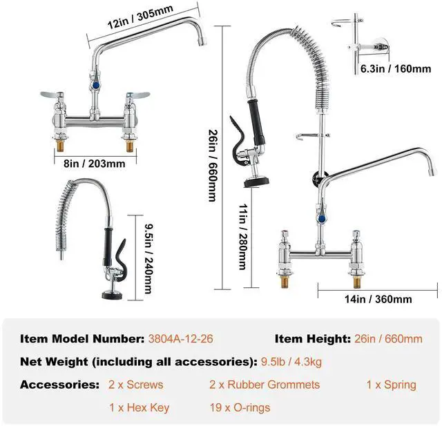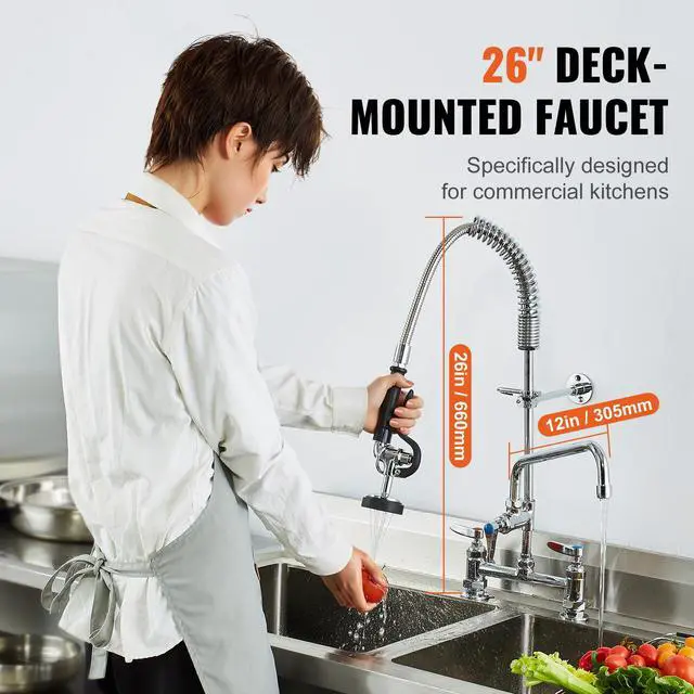 Deck-Mounted Commercial Faucet: This 26-inch tall pre-rinse faucet is designed for installation on kitchen countertops, featuring a spray head and a 12-inch swivel faucet, easily tackling complex and tough dirt challenges. It is suitable for use with 3-compartment professional-grade commercial kitchen sinks.