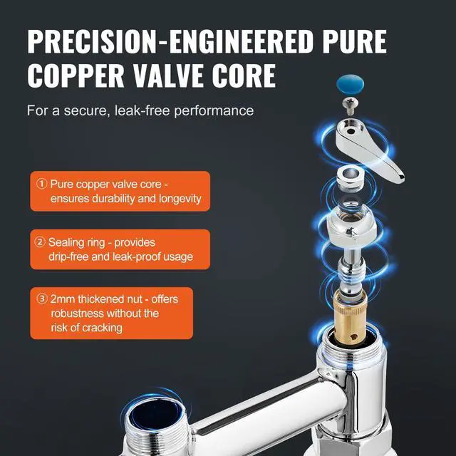 Leak-Proof Tightness: The commercial faucet with sprayer uses a high-quality pure copper valve core that is sturdy, durable, and not prone to cracking. Paired with sealing rings and a 2mm thickened nut, it ensures a strong seal to prevent leaks, saving water while significantly extending its lifespan.