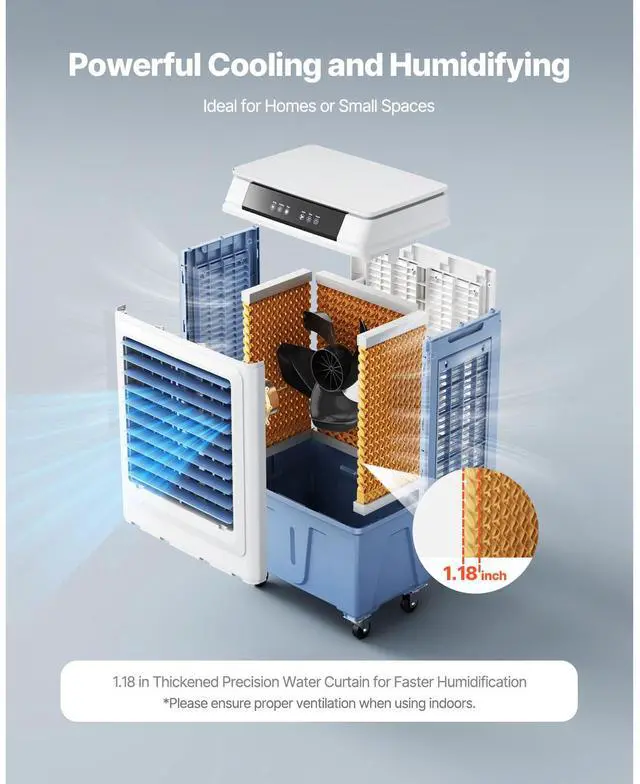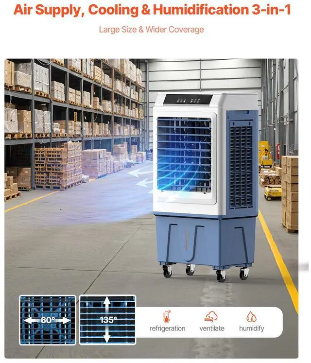 Noise Level: 65dB,Air Volume: 3100 CFM,Water Tank: 9 Gal/34 L,Color: White + Blue,Item Model Number: JH-390Y,Product Dimensions: 18.7 x 13.4 x 38.6 in/475 x 340 x 980 mm,Net Weight: 22.6 lbs/10.25 kg,Power: 113W,Main Material: PP + ABS Plastic