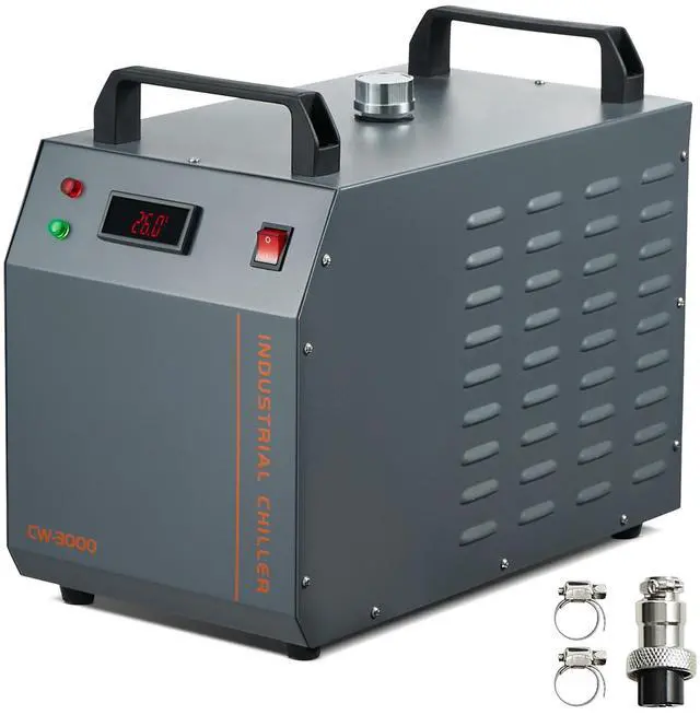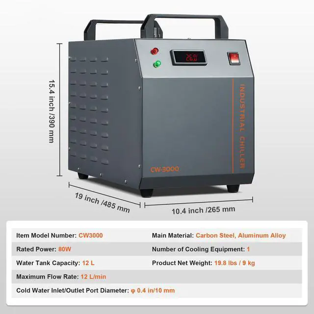 Water Tank Capacity: 12 L,Item Model Number: CW3000,Maximum Flow Rate: 12 L/min,Product Net Weight: 19.8 lbs/9 kg,Rated Power: 80W,Number of Cooling Equipment: 1,Cold Water Inlet/Outlet Port Diameter: 0.4 in/10 mm,Main Material: Carbon Steel, Aluminum Alloy