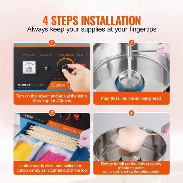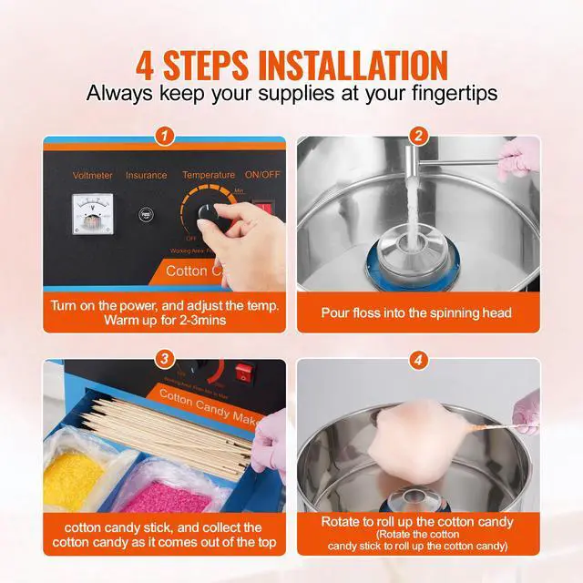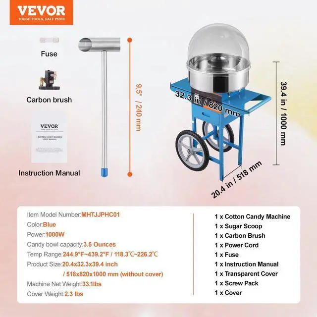 Item Body Weight: 33.1 lbs / 15 kg,Candy Bowl Material: SUS201 Food Grade Stainless Steel,Cover Weight: 2.3 lbs / 1.06 kg,Item Size: 20.4x32.3x39.4 inch / 518x820x1000 mm,Candy Bowl Capacity: 3.5 Ounces ±5%,Color: Blue,Item Model Number: MHTJJPHC01,Rated Power: 1000W,Cotton Candy Yield: 6 pcs/min,Temp Range: 244.9x439.2°F / 118.3-226.2