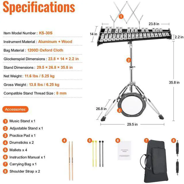 Compatible Stand Thread Size: 0.3 in/8 mm,Bag Material: 1200D Oxford Cloth,Gross Weight: 13.8 lbs/6.25 kg,Glockenspiel Dimensions: 23.8 x 14 x 2.2 in/604 x 355 x 55 mm,Instrument Material: Aluminum + Wood,Item Model Number: KS-30S,Stand Dimensions: 29.5 x 26.8 x 35.8 in/750 x 680 x 910 mm,Net Weight: 11.6 lbs/5.25 kg