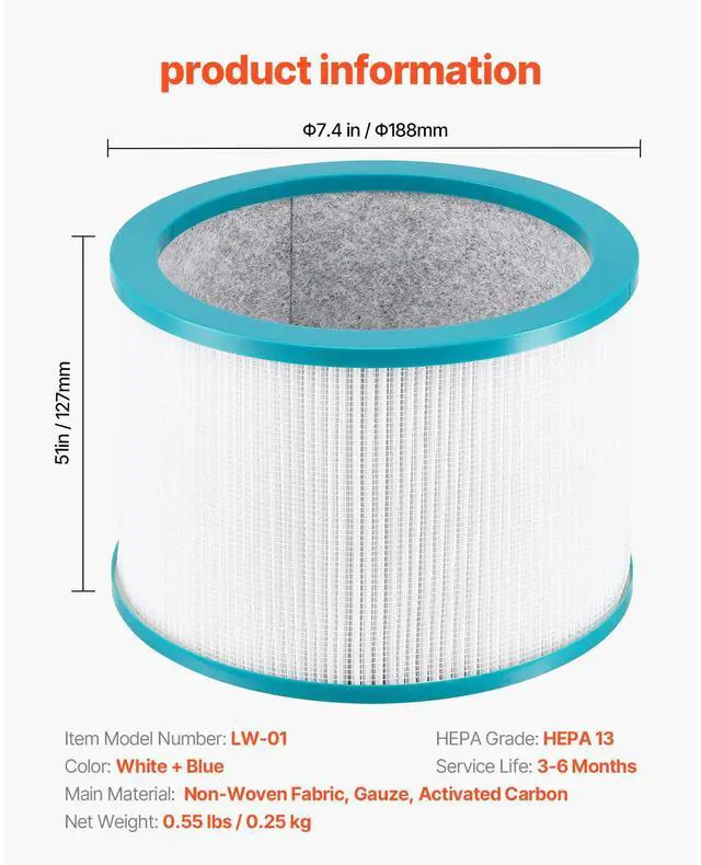 Service Life: 3-6 Months,Filtration Grade: HEPA 13,Color: White + Blue,Item Model Number: LW-01,Item Dimensions: 7.4 x 5 inch / 188 x 127 mm,Net Weight: 0.55 lbs / 0.25 kg,Main Material: Non-Woven Fabric, Gauze, Activated Carbon