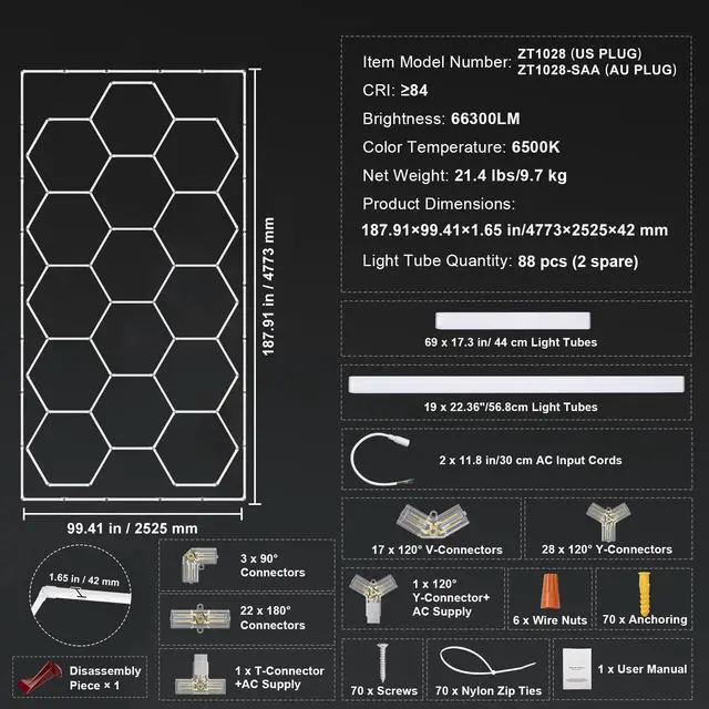 Color Temperature: 6500K,Brightness: 66300LM,Item Model Number: ZT1028-SAA,CRI: 84,Product Dimensions: 190.6 x 95.8 x 1.7 in/4840 x 2433 x 42 mm,Net Weight: 21.4 lbs/9.7 kg,Light Tube Quantity: 72 pcs