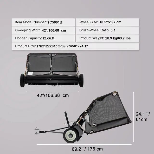 Sweeping Width: 42"/106.6 cm,Hopper Capacity: 12.cu.ft.,Wheel Size: 10.5"/26.7 cm,Brush-Wheel Ratio: 5:1,Item Model Number: TC5001B,Product Weight: 28.9 kg/63.7 lbs,Product Size: 176x127x61cm/69.2"×50"×24.1"