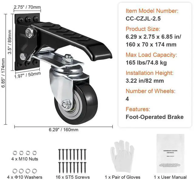 Installation Height: 3.22 in/82 mm,Item Model Number: CC-CZJL-2.5,Max Load Capacity: 165 lbs/74.8 kg,Features: Foot-Operated Brake,Number of Wheels: 4,Product Size: 6.29 x 2.75 x 6.85 in/160 x 70 x 174 mm