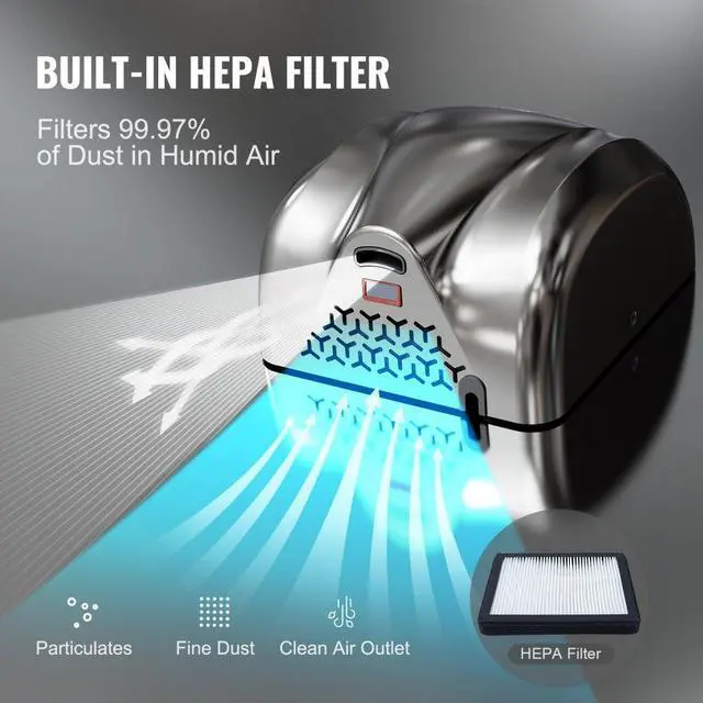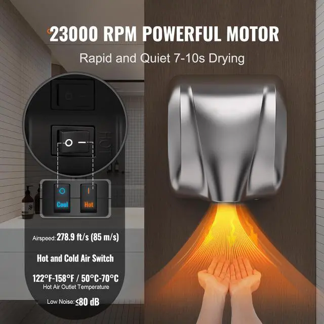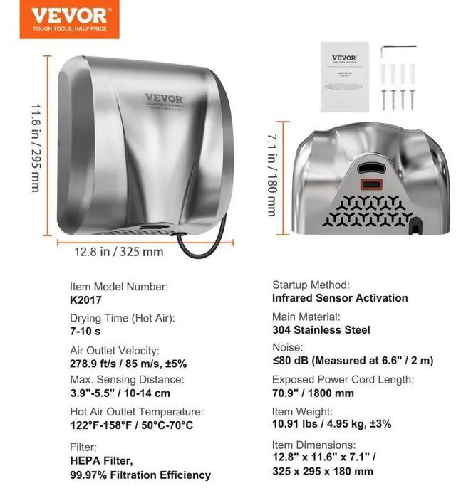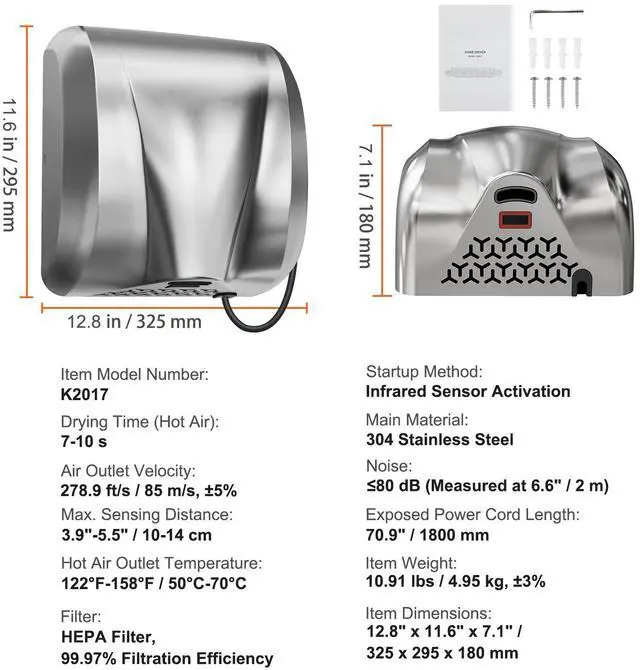 Noise: 80 dB (Measured at 6.6" / 2 m),Air Outlet Velocity: 278.9 ft/s / 85 m/s, ±5%,Hot Air Outlet Temperature: 122°F-158°F / 50°C-70°C,Exposed Power Cord Length: 70.9" / 1800 mm,Max. Sensing Distance: 3.9"-5.5" / 10-14 cm,Filter: HEPA Filter, 99.97% Filtration Efficiency,Startup Method: Infrared Sensor Activation,Voltage: 120V AC,Item Model Number: K2017,Frequency: 60 Hz,Drying Time (Hot Air): 7-10 s,Item Dimensions: 12.8" x 11.6" x 7.1" / 325 x 295 x 180 mm,Power: Hot Air: 1300 W, Cold Air: 550 W, (+5% / -10%),Main Material: 304 Stainless Steel,Item Weight: 10.91 lbs / 4.95 kg, ±3%