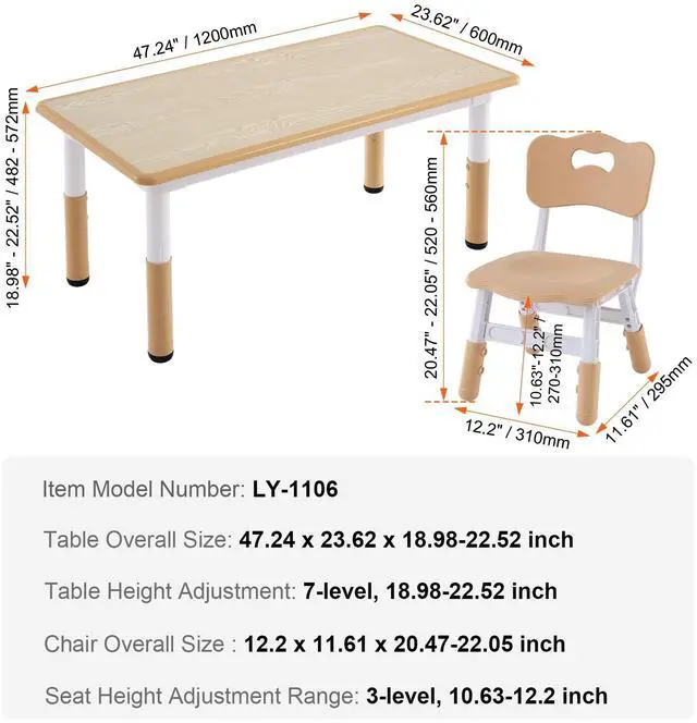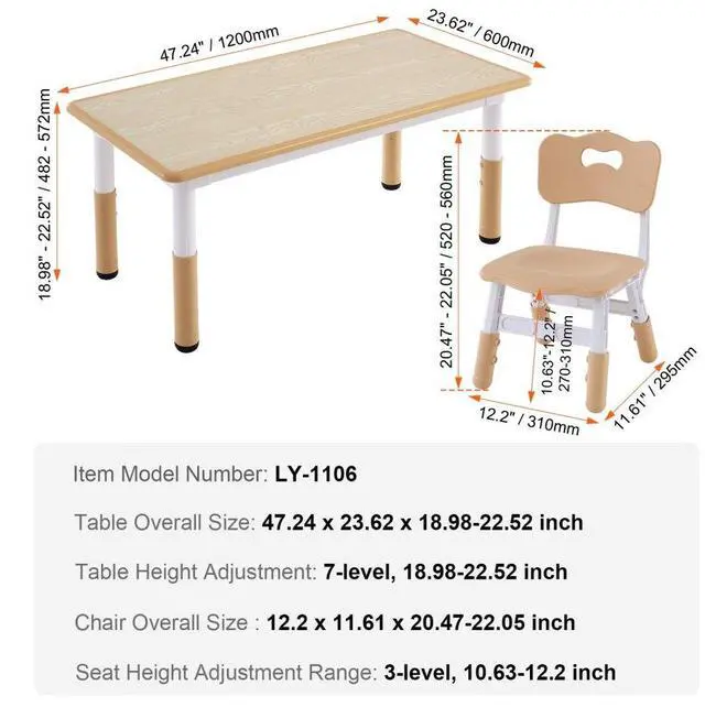 Material Surface Treatment: Melamine Laminate Finish,Chair Load Capacity: 180 lbs,Table Height Adjustment: 7-level, 18.98-22.52 inch,Combination: One Table+ Four Chairs,Edge Treatment: PP Edge Banding,Item Model Number: LY-1106,Product Weight: 41.89 lbs,Table Load Capacity: 300 lbs,Table Overall Size: 47.24 x 23.62 x 18.98-22.52 inch,Seat Height Adjustment Range: 3-level, 10.63-12.2 inch,Main Material: PP+Particleboard Veneer Tabletop (P2 Grade),Chair Overall Size:12.2 x 11.61 x 20.47-22.05 inch