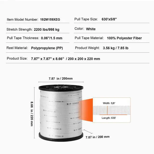 Pull Tape Size: 630' x 5/8" (192 m x 1.6 cm),Pull Tape Material: 100% Polyester Fiber,Color: White,Item Model Number: 192M159XEG,Product Weight: 7.85 lbs/3.56 kg,Stretch Strength: 2200 lbf/998 kgf,Pull Tape Thickness: 0.06"/1.5 mm,Reel Material: Polypropylene (PP),Product Size: 7.87" x 7.87" x 8.66"/200 x 200 x 220 mm