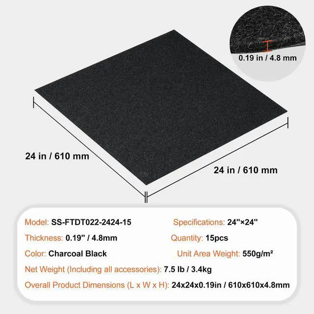 Thickness: 0.19 / 4.83mm,Specifications: 24"×24",Color: Charcoal Black,Overall Product Dimensions (L x W x H): 24x24x0.19in / 610x610x4.8mm,Model: SS-FTDT022-2424-15,Quantity: 15pcs,Unit Area Weight: 550g/m²,Net Weight (Including all accessories): 4.41lb / 2kg