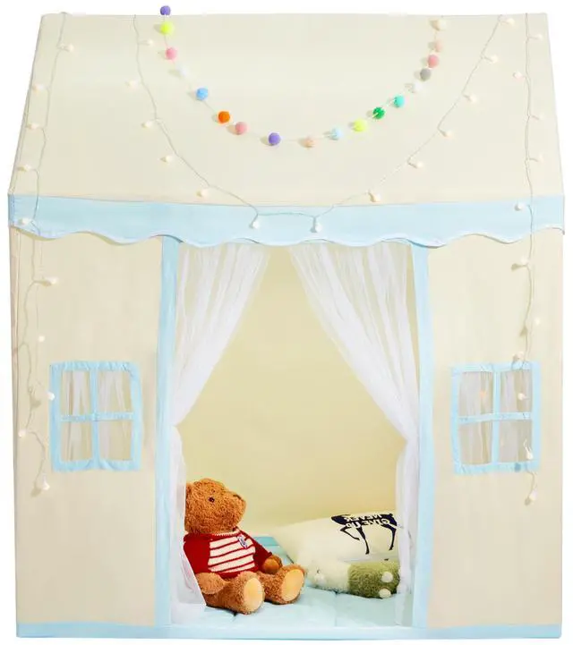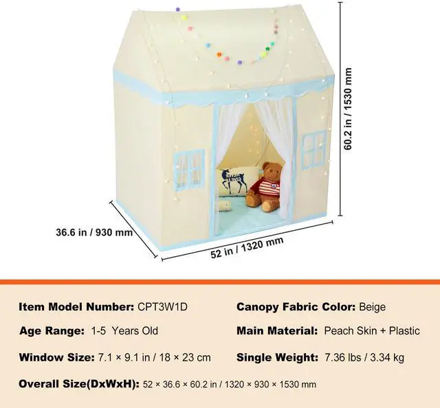 Shape: House, 1 Door 3 Windows,Canopy Fabric Color: Beige,Window Size: 7.1 x 9.1 in / 18 x 23 cm,Age Range: 1-5 Years Old,Item Model Number: CPT3W1D,Overall Size(DxWxH) : 52 x 35 x 60 in / 132 x 89 x 152 cm,Main Material: Peach Skin + Plastic