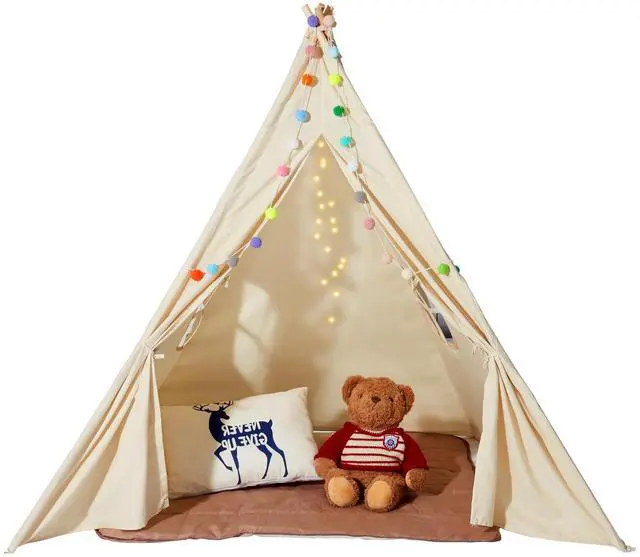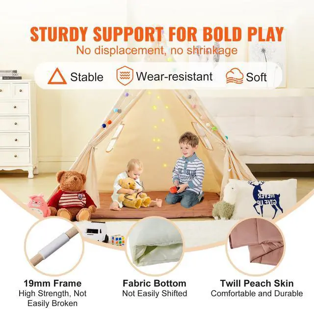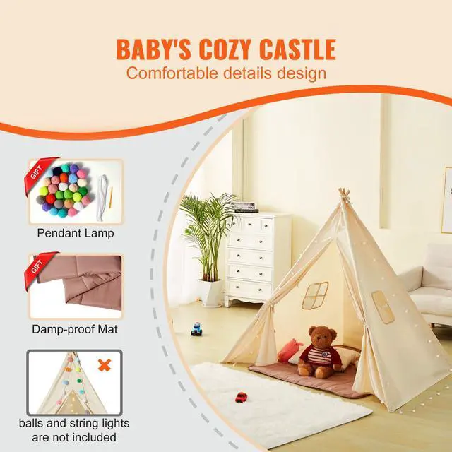 VEVOR Kids Play Tent, Teepee Tent for Kids 1-5 Years Old, Tent for Kids with Windows for Indoor and Outdoor, Toddler Tent with Mat and Plush Decorative Balls, for Boys and Girls, Beige