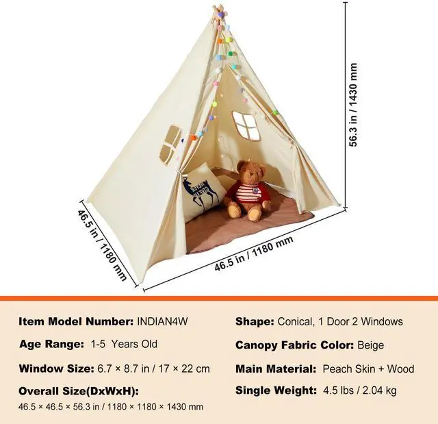 Shape: Conical, 1 Door 2 Windows,Canopy Fabric Color: Beige,Window Size: 6.7 x 8.7 in / 17 x 22 cm,Age Range: 1-5 Years Old,Item Model Number: INDIAN4W,Overall Size(DxWxH) : 46.5 x 46.5 x 56.3 in / 118 x 118 x 143 cm,Main Material: Peach Skin + Wood