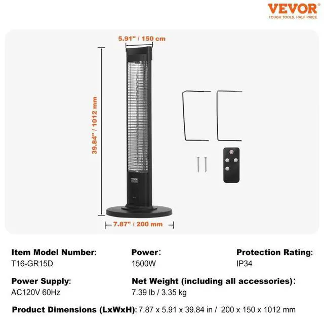 Protection Rating: IP34,Net Weight (including all accessories): 7.39 lb / 3.35 kg,Overall Dimensions (L x W x H): 7.87x5.91x39.84 in / 200x150x1012 mm,Heating Tube Type: Carbon Brazing,Model: T16-GR15D,Power: 1500W (+5%, -10%),Gear: 3rd Gear,Power Supply: AC120V 60Hz