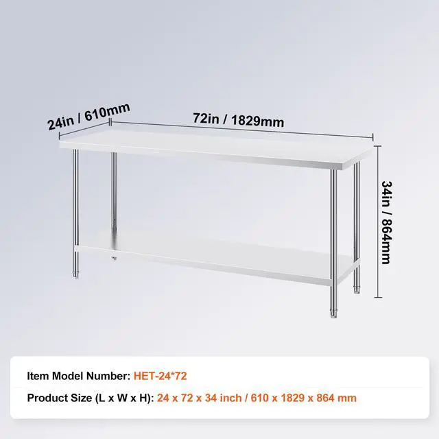 Height Adjustment: 3 Levels,Product Size (L x W x H): 24 x 72 x 34 inch / 610 x 1829 x 864 mm,Item Model Number: HET-24*72,Product Weight: 64 lbs /29.2 kg,Material: Stainless Steel