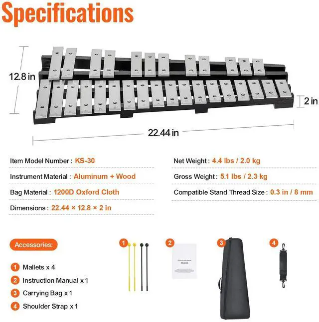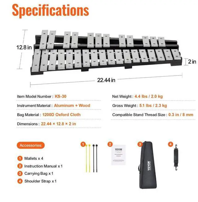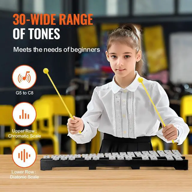 VEVOR 30 Note Glockenspiel Xylophone Bell Kit, Percussion Instrument with Mallets, Drum Sticks and Carrying Bag, Professional Glockenspiel Xylophone Percussion Instrument Set for Students & Adults