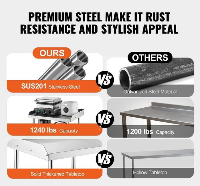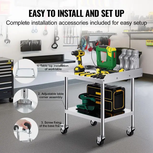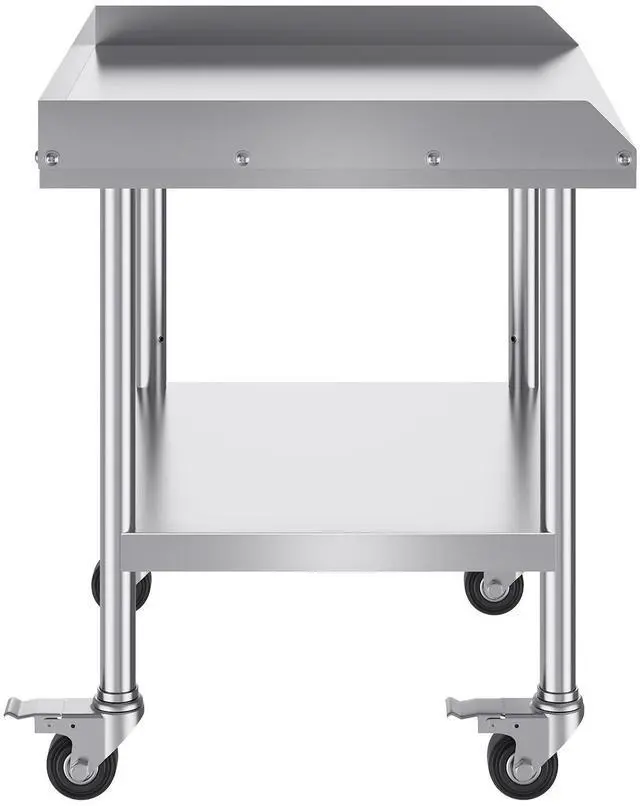 VEVOR Stainless Steel Work Table, 24 x 28 x 30 Inch Commercial Food Prep Worktable with 4 Wheels, Casters, 3-Sided Backsplash Heavy Duty Prep Worktable, Metal Work Table for Restaurant Home Hotel