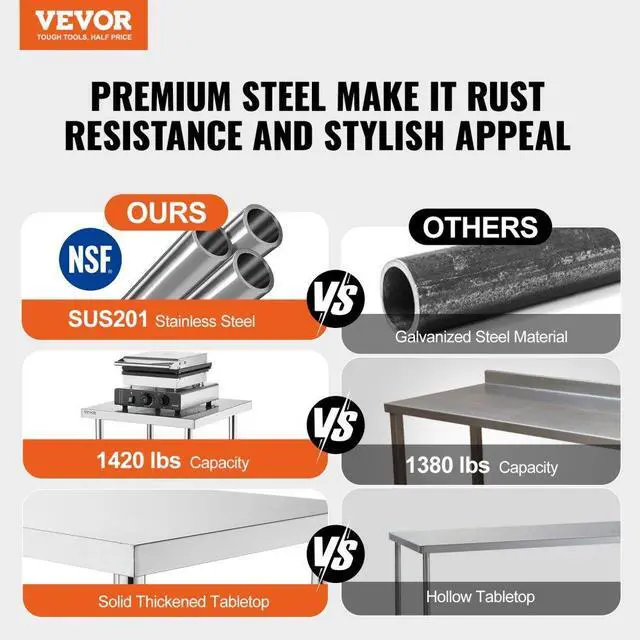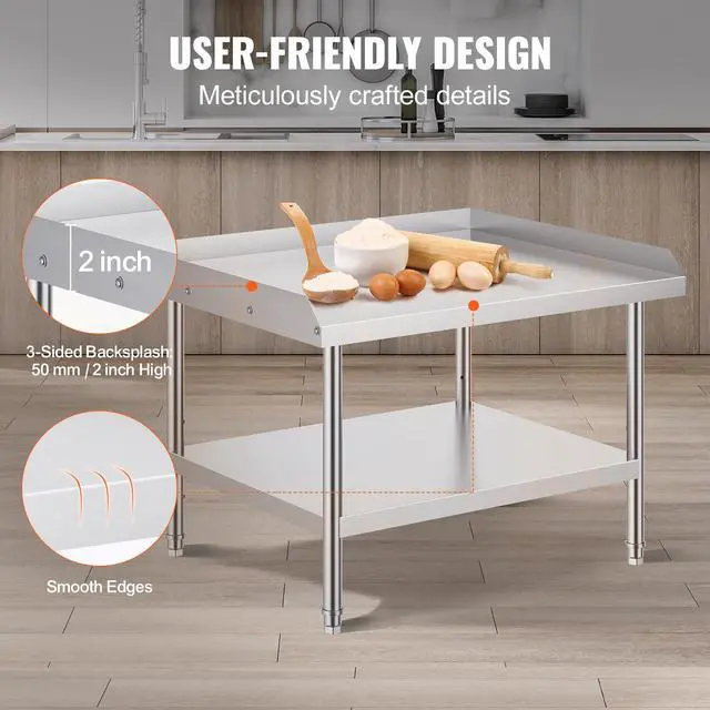 VEVOR Stainless Steel Work Table, 30 x 36 x 26 Inch Commercial Food Prep Worktable, 3-Sided Backsplash Heavy Duty Prep Worktable, Metal Work Table with Adjustable Height for Restaurant Home Hotel