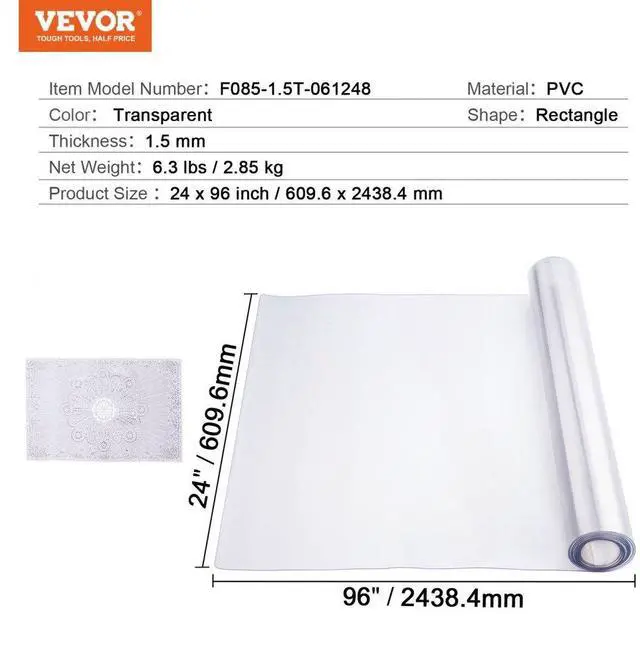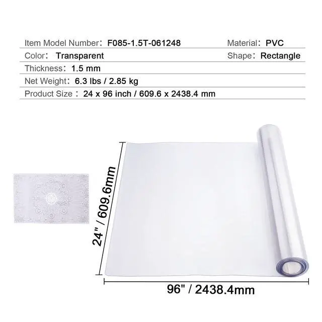 Thickness: 1.5 mm,Shape: Rectangle,Table Protector Size: 24x96 inch / 609.6x2438.4mm,Color: Transparent,Item Model Number: F085-1.5T-061248,Material: PVC,Net Weight: 6.3 lbs / 2.85 kg