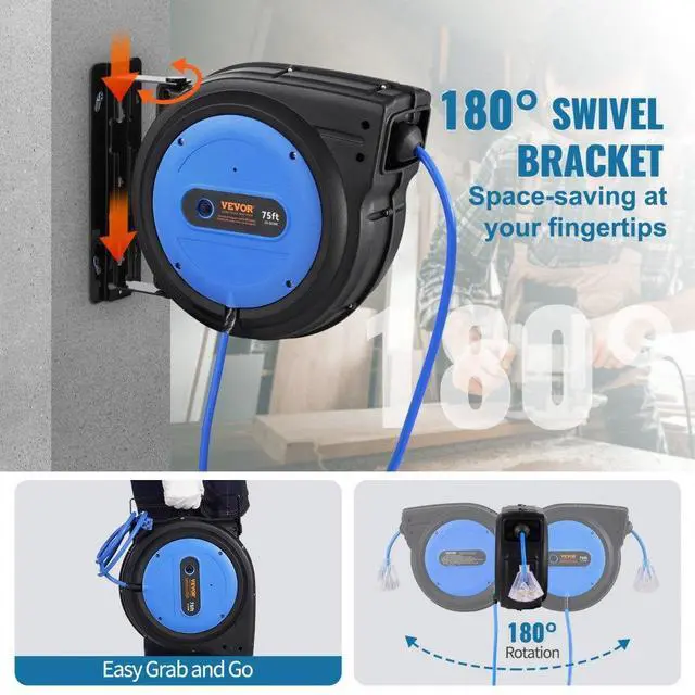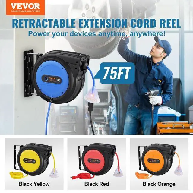 VEVOR Retractable Extension Cord Reel Power Cord Reel 75FT 14AWG/3C SJTOW