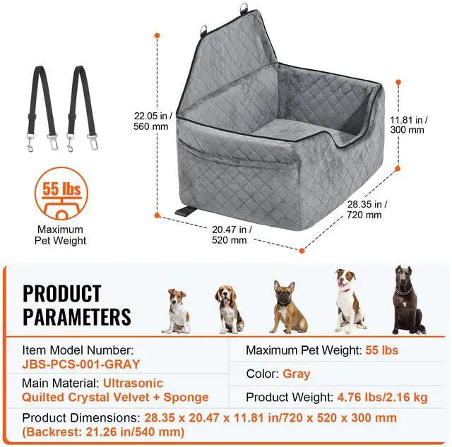 Color: Gray,Item Model Number: JBS-PCS-001-GRAY,Maximum Pet Weight: 55 lbs,Product Dimensions: 28.35"x20.47"x11.81"/720x520x300 mm (Backrest: 540mm/21.26",Net Weight: 4.76 lbs/2.16 kg,Main Material: Ultrasonic Quilted Crystal Velvet + Sponge