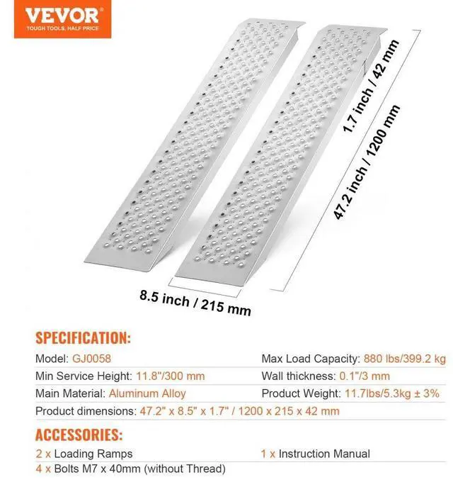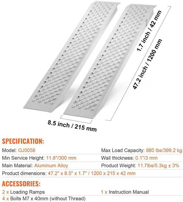 VEVOR 47.2" x 8.5" Aluminum Ramps 880 LBS Capacity Loading Ramps 2PCS