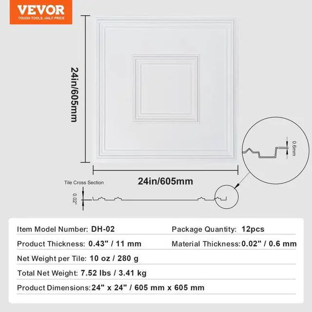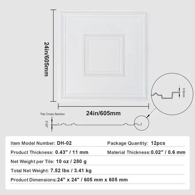 Total Net Weight: 7.52 lbs / 3.41 kg,Color: White,Item Model Number: DH-02,Net Weight per Tile: 10 oz / 280 g,Package Quantity: 12 pcs,Product Thickness: 0.43" / 11 mm,Product Dimensions: 24" x 24" / 605 mm x 605 mm,Material Thickness: 0.02" / 0.6 mm,Main Material: PVC