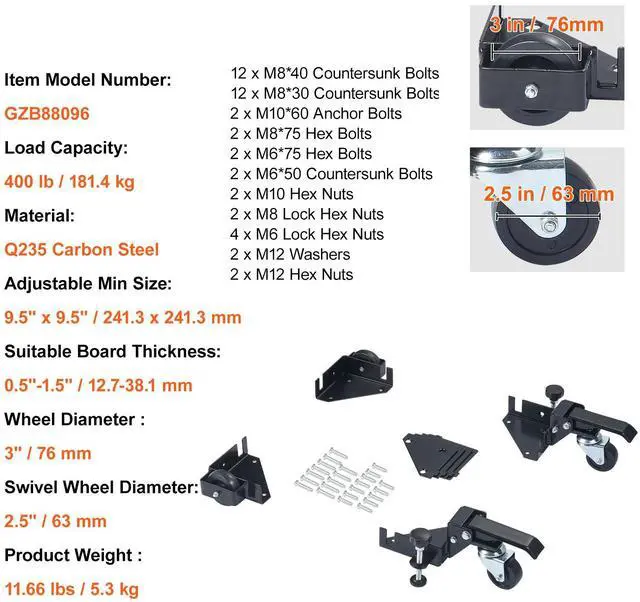Suitable Board Thickness: 0.5"-1.5" / 12.7-38.1 mm,Load Capacity: 400 lbs / 181.4 kg,Adjustable Min Size: 9.5" x 9.5" / 241.3 x 241.3 mm,Item Model Number: GZB88096,Directional Wheel Diameter: 3" / 76 mm,Product Weight: 11.66 lbs / 5.3 kg,Material: Q235 Carbon Steel,Swivel Wheel Diameter: 2.5" / 63 mm