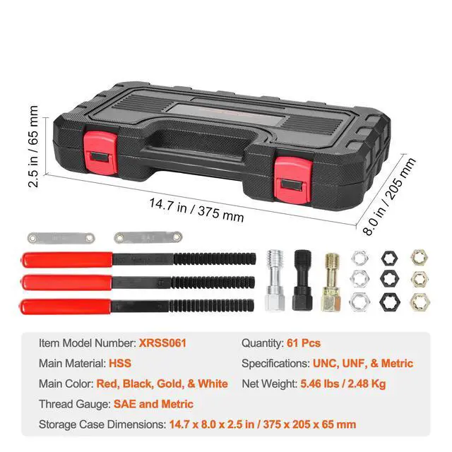 Main Color: Red, Black, Gold, & White,Specifications: UNC, UNF, & Metric,Item Model Number: XRSS061,Quantity: 61 Pcs,Main Material: HSS