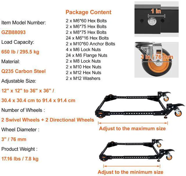 Load Capacity: 650 lbs / 295.5 kg,Item Model Number: GZB88093,Product Weight: 17.16 lbs / 7.8 kg,Material: Q235 Carbon Steel,Wheel Diameter: 3" / 76 mm,Adjustable Size: 12" x 12" to 36" x 36" / 304 x 304 mm to 914 x 914 mm,Number of Wheels: 2 Directional Wheels + 2 Swivel Wheels