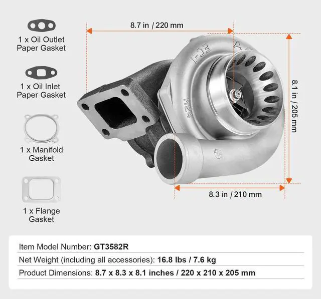 Net Weight (including all accessories): 16.8 lbs / 7.6 kg,Item Model Number: GT3582R,Product Dimensions: 8.7 x 8.3 x 8.1 inches / 220 x 210 x 205 mm