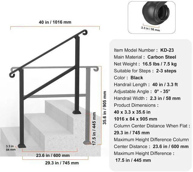 Maximum Height Difference Column Center Distance: 23.6 in / 600 mm,Handrail Width: 2.3 in / 58 mm,Handrail Length: 40 in / 3.3 ft,Column Center Distance When Flat: 29.3 in / 745 mm,Color: Black,Item Model Number: KD-23,Product Dimensions: 40 x 3.3 x 35.6 in / 1016 x 84 x 905 mm,Suitable for Steps: 2-3 steps,Net Weight: 16.5 lbs / 7.5 kg,Maximum Height Difference: 17.5 in / 445 mm,Adjustable Angle: 0° - 35°,Main Material: Carbon Steel