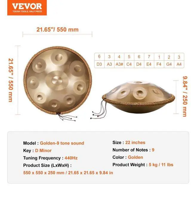 Product Size (LxWxH): 550 x 550 x 250 mm / 21.65 x 21.65 x 9.84 in,Size: 22 inches,Color: Golden,Item Model Number: Golden-9 tone sound,Number of Notes: 9,Product Weight: 5 kg / 11 lbs,Tuning Frequency: 440Hz,Key: D Minor