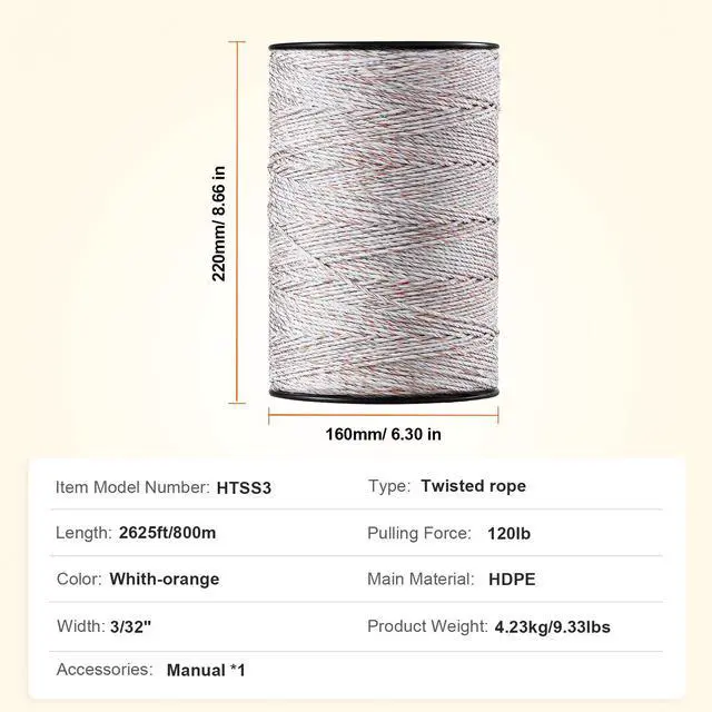 Pulling Force: 120lb,Length: 2625ft/800m,Color: White, Orange,Item Model Number: HTSS3,Product Weight: 4.23kg/7.12lbs,Main Material: HDPE