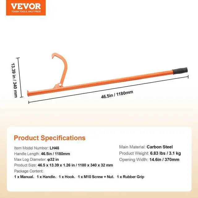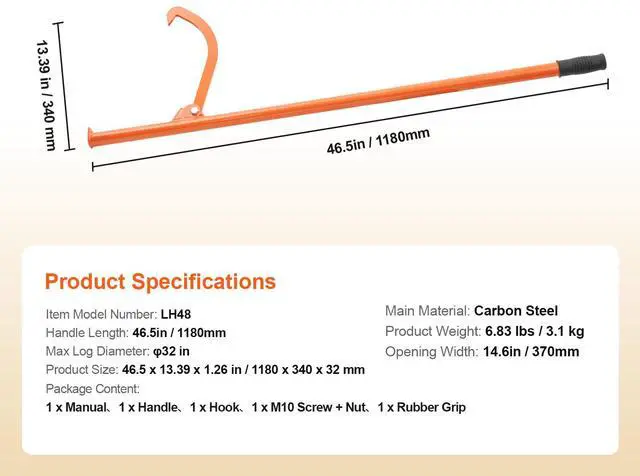 Handle Length: 46.5 in / 1180 mm,Opening Width: 14.6 in / 370 mm,Item Model Number:LH48,Product Weight: 6.83 lbs / 3.1 kg,Max Log Diameter: 32 in,Main Material: Carbon Steel,Product Size: 46.5 x 13.39 x 1.26 in / 1180 x 340 x 32 mm